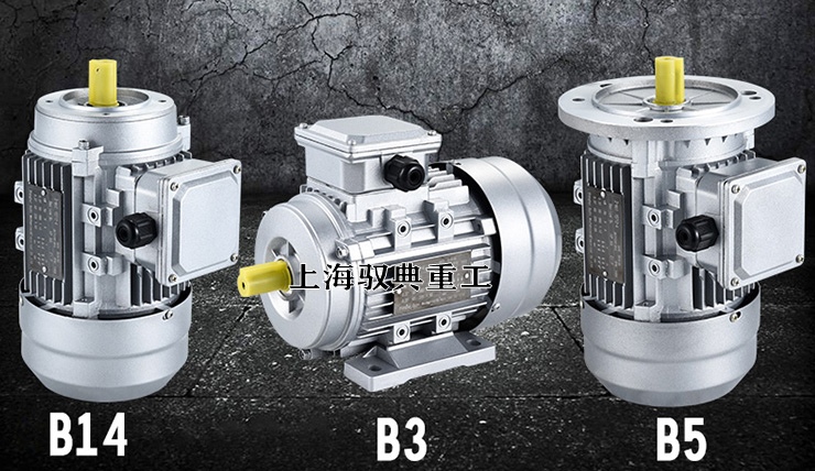 上圖所示,是三相異步電機(jī)的三種安裝形式,分別是B14、B3、B5這三種,B3是臥式安裝,通過(guò)圖片我們也可以看出,帶地腳的;B14、B5是立式安裝,雖然是立式電機(jī),但是并不代表他一定是立著垂直安裝的,他的安裝孔在上方,可以立起來(lái)安裝,也可以平行安裝,具體根據(jù)使用環(huán)境靈活運(yùn)用就可以了。B14是小法蘭安裝,B5是大法蘭安裝。