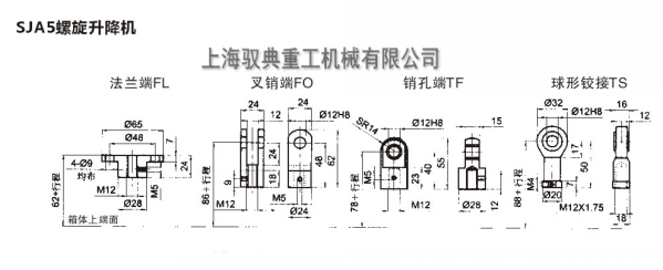 SJA系列升降機(jī)有兩種裝配方式:一是絲桿做升降運動;二是絲桿只轉(zhuǎn)動不升降,通過絲桿旋轉(zhuǎn),帶動螺母做上下升降運動。絲桿頭部形式有四種方式供客戶選擇:法蘭端FL、插銷端FO、銷孔端TF、球星鉸鏈TS。見下圖。